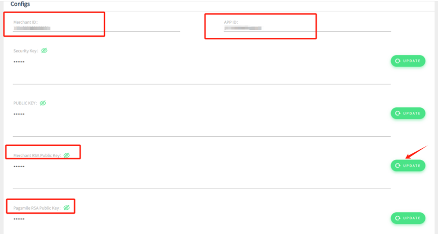 <figure><img src="https://4142198059-files.gitbook.io/~/files/v0/b/gitbook-x-prod.appspot.com/o/spaces%2F-MgOGd5QxlX-U1mkQpVU%2Fuploads%2FxJm1z2qxHV0c7mPH4ErV%2Fimage.png?alt=media&#x26;token=0579d970-03c2-4471-85e5-c86f22af9ead" alt=""><figcaption><p>Get Merchant ID (Partner ID), APP ID, and Pagsmile RSA Public Key<br>Update your RSA public key in the Merchant RSA Public Key section</p></figcaption></figure>